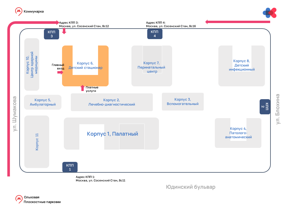 - Для маломобильных пациентов въезд на территорию через КПП 3. После высадки пациента автомобиль должен покинуть территорию.
