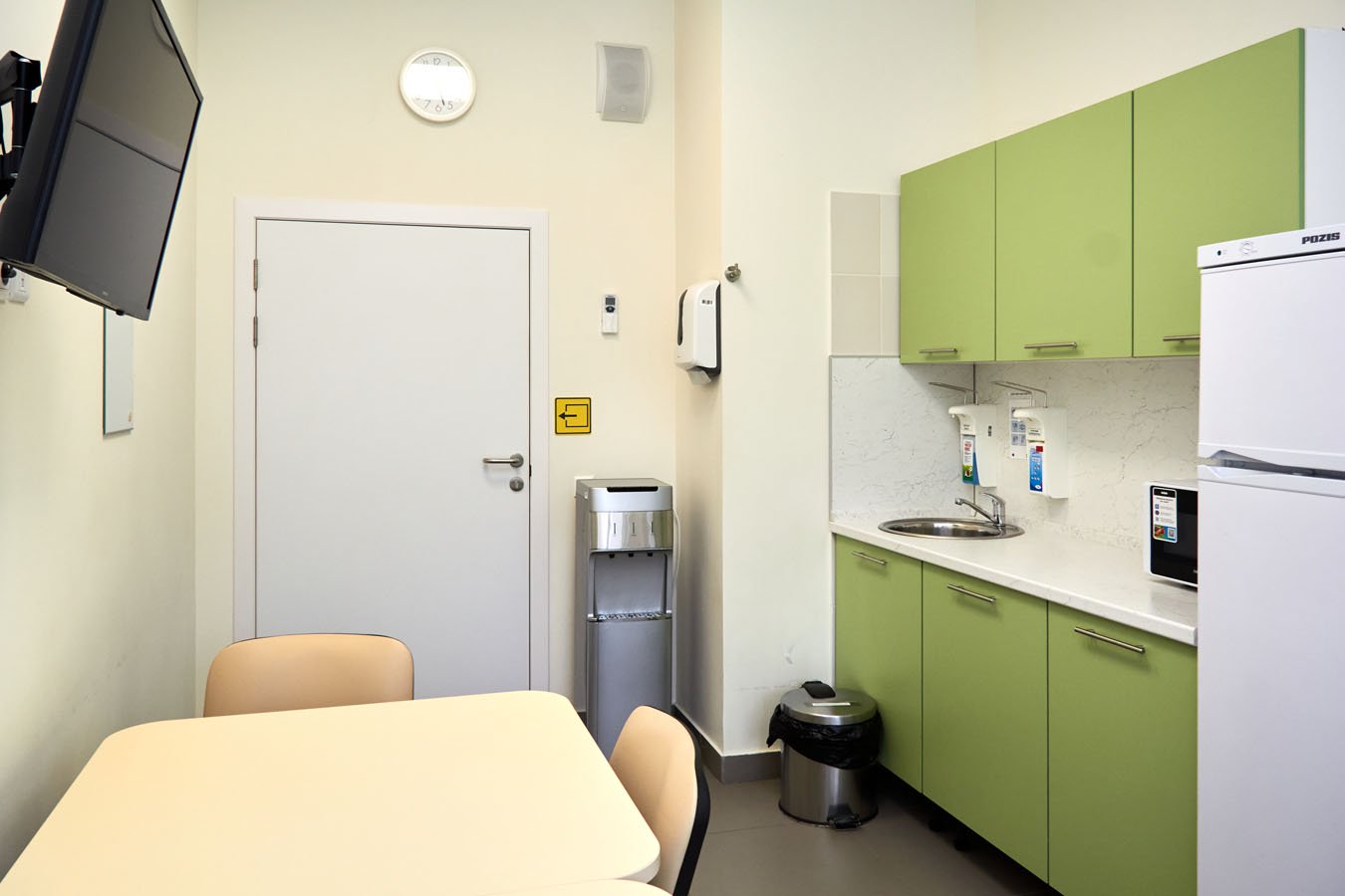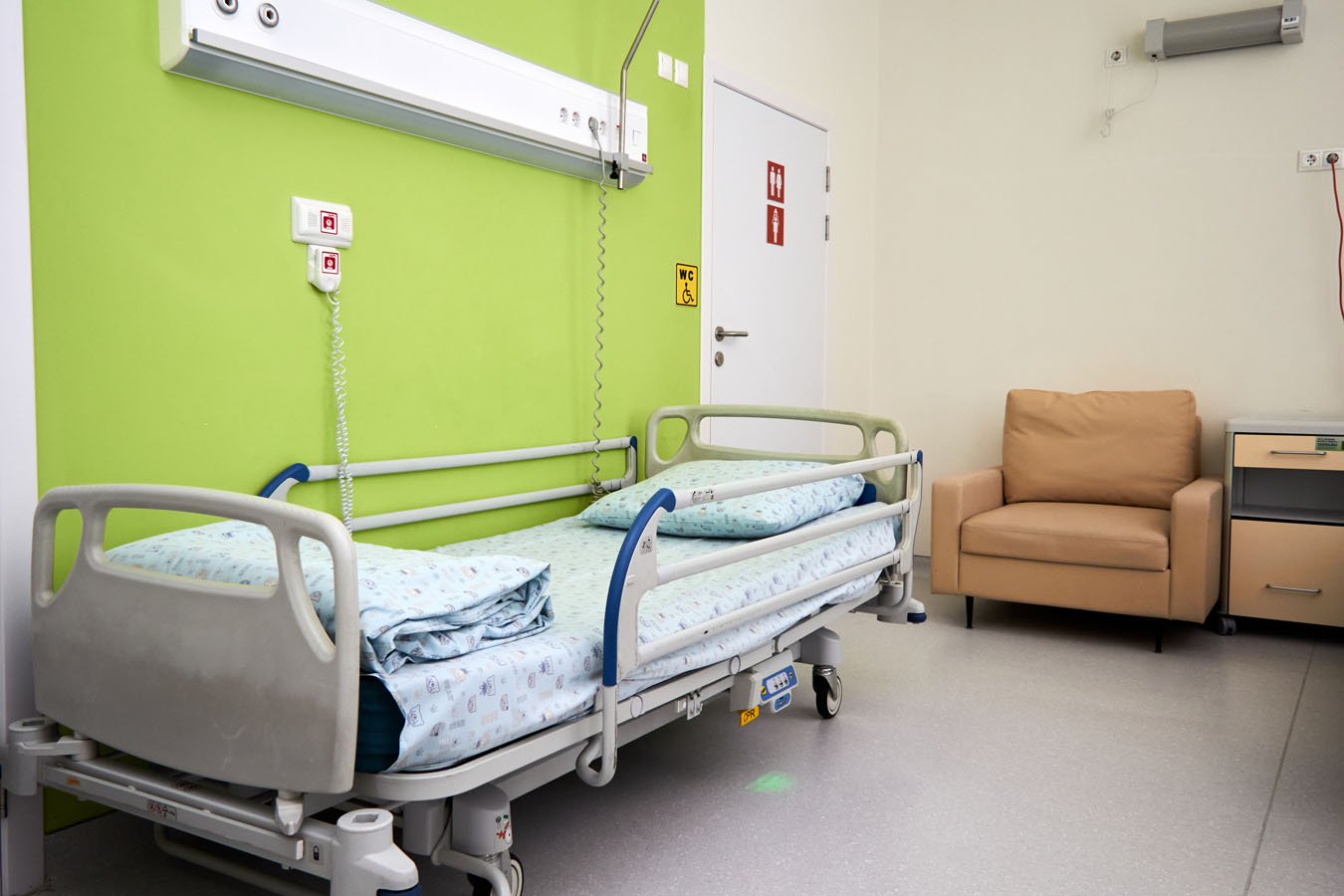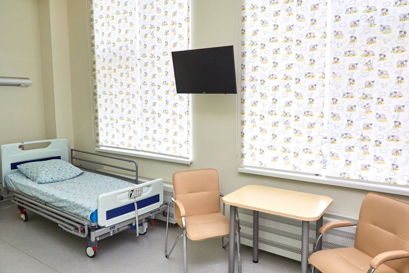 В палатах есть все необходимое: кровати-трансформеры с пультом для регулировки наклона, пеленальный столик, раскладное кресло, стол и стулья, телевизор, тумба для хранения вещей. В каждой палате есть собственный санузел с душем.При госпитализации с ребенком до 4 лет взрослый получает полный рацион горячего питания. Если вы сопровождаете ребенка старше 4 лет, свое питание вы обеспечиваете сами. В помощь вам на каждом этаже есть комнаты для отдыха родителей. Там вы найдете холодильник для хранения продуктов, печку СВЧ для разогрева, кухонный уголок, столы и стулья. На первом этаже корпуса в главном холле есть буфет и вендинговые автоматы. При необходимости вы вправе на время покинуть отделение, только обязательно сообщите медицинскому персоналу, на какое время ваш ребенок остается без вас.