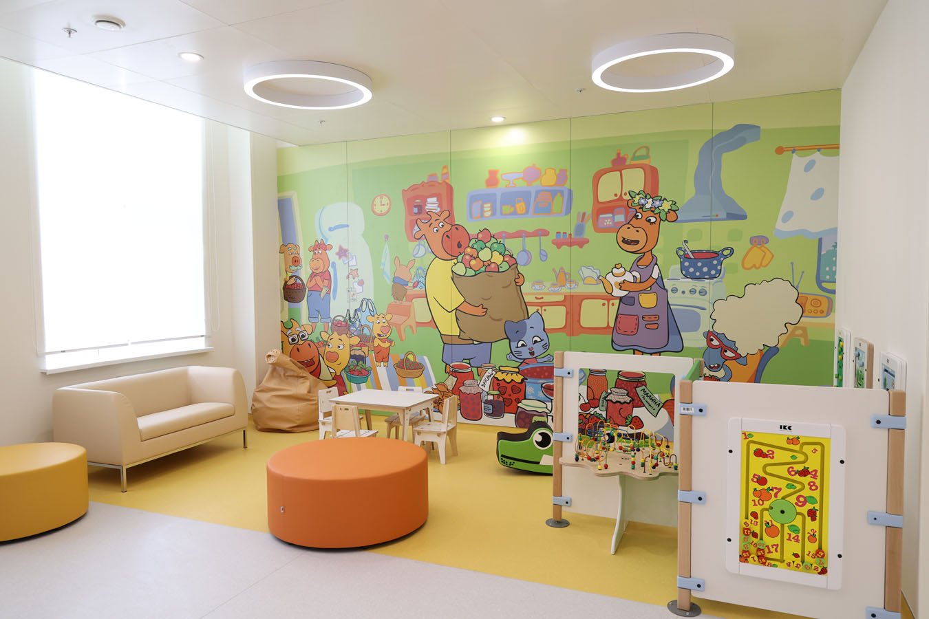 Ребенок может читать, рисовать, играть в своей палате – не забудьте взять минимальный набор книг, бумаги, карандашей и игрушек. В палате есть телевизор. Смотрите мультики, кино, просветительские передачи.На каждом этаже оборудованы открытые игровые зоны, где дети могут играть в присутствии взрослых.