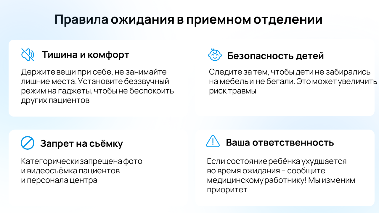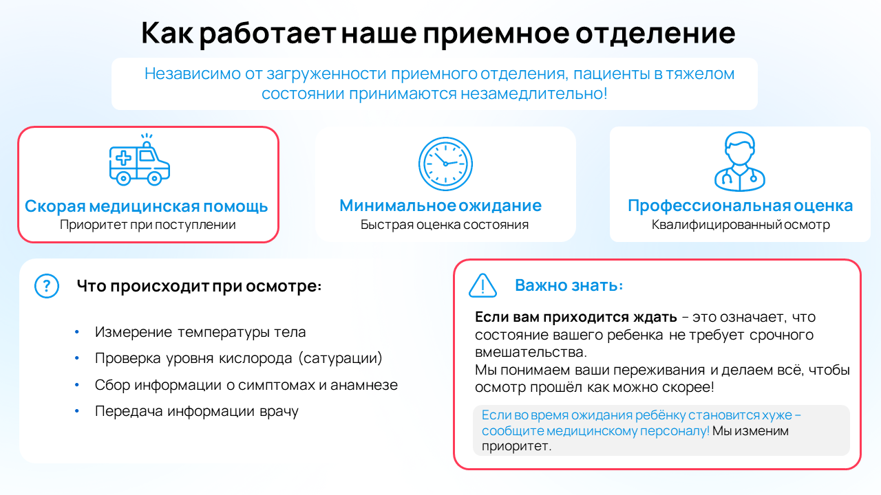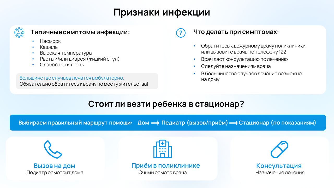 Приемное отделение детского инфекционного стационара принимает детей с 1 месяца жизни до 18 лет по направлению из другого медицинского учреждения и по каналу Скорой помощи. Рекомендации по обращению за медицинской помощью при подозрении на инфекцию у ребенка: